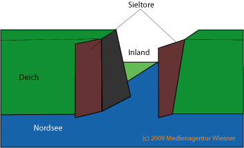 Im Gegensatz dazu soll das Wasser bei Ebbe abfließen. Dazu öffnen sich die Sieltore durch den Druck der Wassermassen aus dem Binnenland.